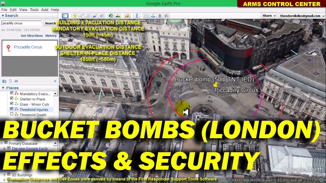 At first sight, the Outdoor Evacuation Distance for a 50lb IED defined by the Department of Homeland Security seems unrealistically large. If such a bucket bomb had been found at the Piccadilly Circus, according to the proposed Outdoor Evacuation Distances many London City blocks should have been evacuated, causing unnecessarily many exaggerated financial and psychological impacts. Although the much more realistic 100-meter red color Evacuation area would suffice for bucket bombs, our Arms Control Center advises that the DHS standards should be applied in all cases, if possible.