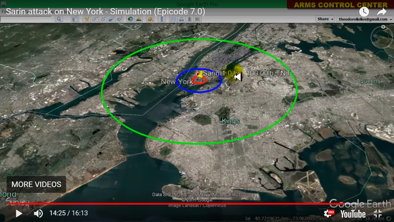 Posted by Arms Control Center in CHEMICAL WEAPONS, tags: chemical war, chemical weapons, gas attack, Sarin, sarin attack, sarin gasOne kg of Sarin is dispersed explosively in New York using 100 lb of TNT. The Epicode 7.0 program is used to simulate the event at a random ground zero in New York and the results are displayed on 3D Google Earth maps. This exercise is in the framework of the Arms Control Certificate seminars offered by the Arms Control Center